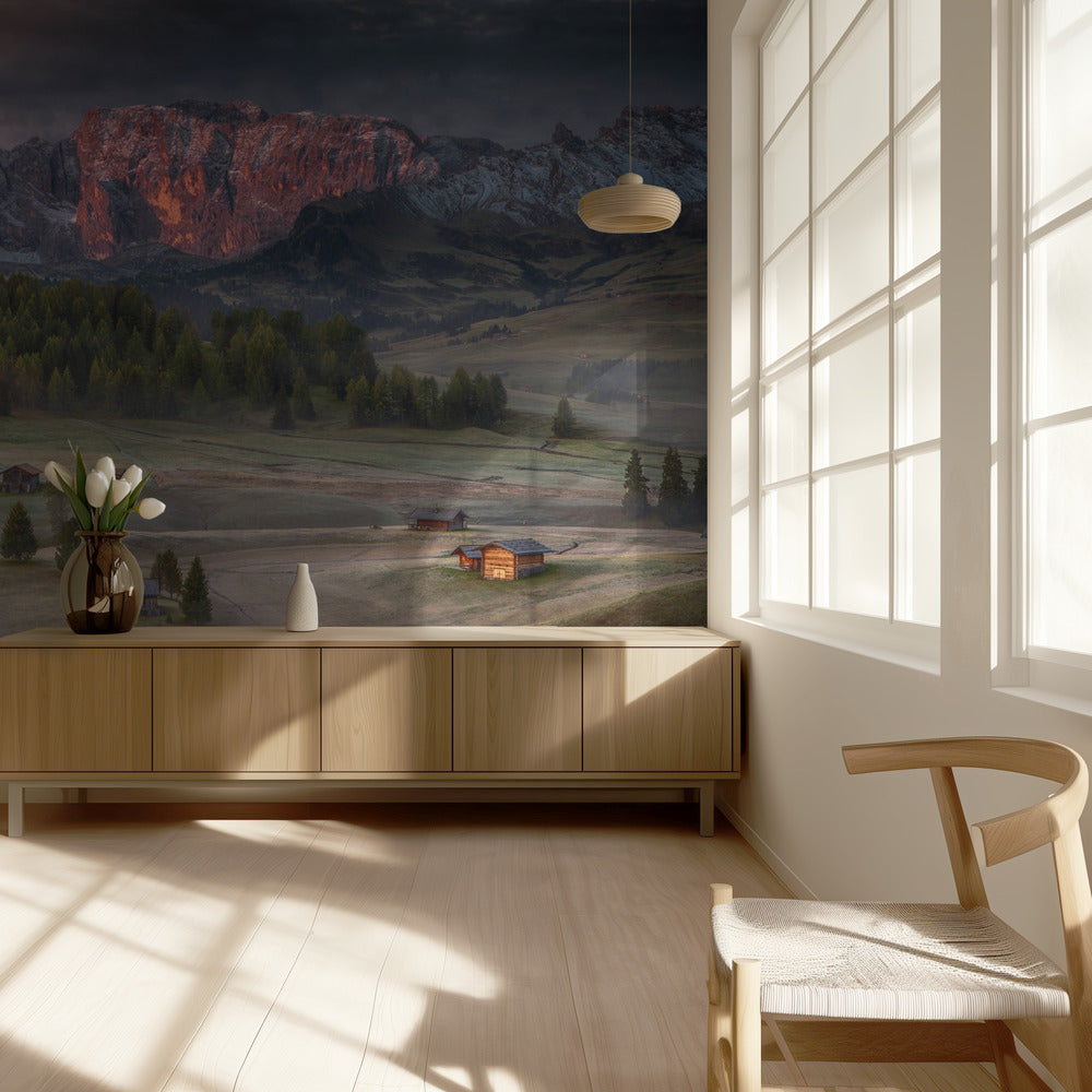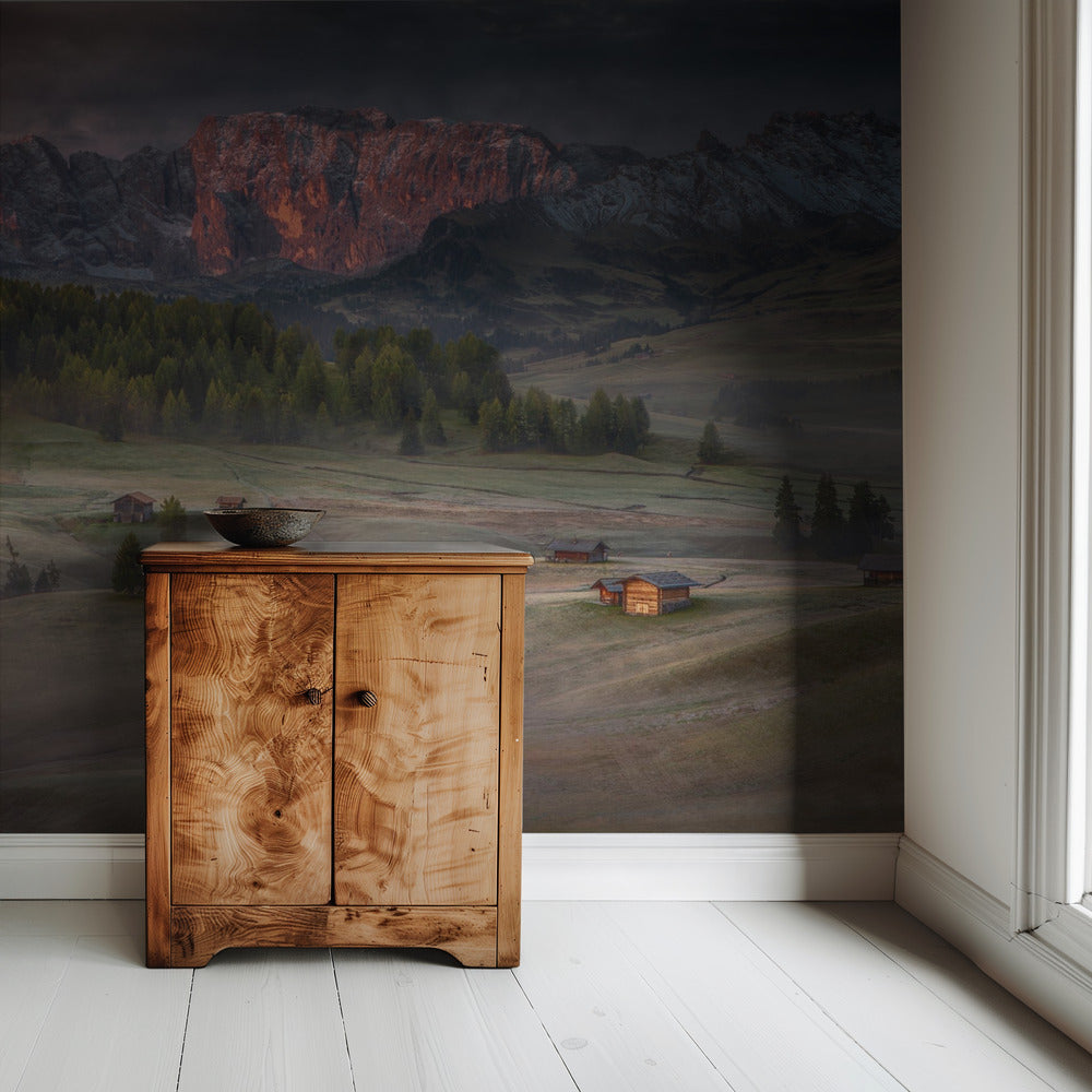 Burning mountains over the frozen valley | Wallpaper